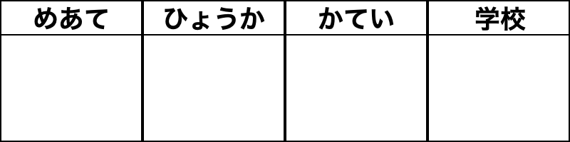 同じデザインで横並びにしてしまうと、どうしても同じようなものが並んでいると感じてしまうものだ。下のようにせめて「かてい」と「学校」は、それ以外と離すべきだったのではないだろうか。あと、わかりやすく例を最初の行に入れておくと理解が早かったかもしれない。(この解釈が正しいかはわからないけれど)